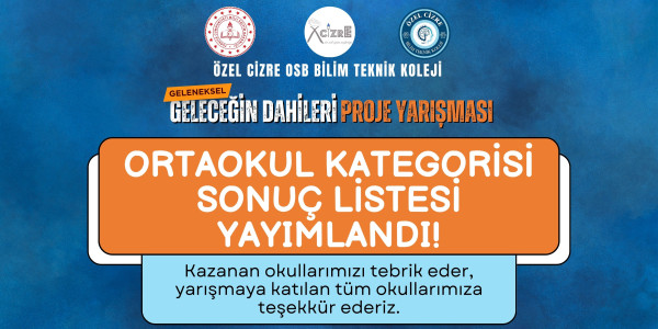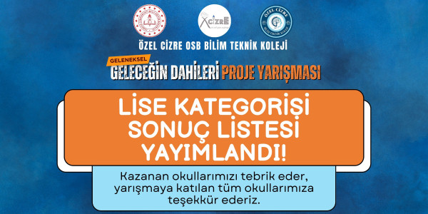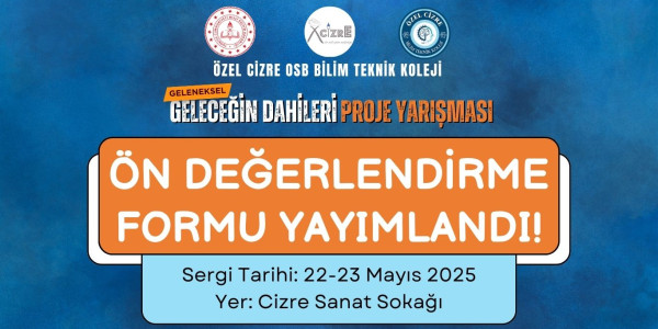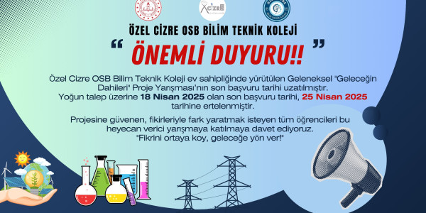 Özel Cizre OSB Bilim Teknik Koleji'nin ev sahipliğinde ve İlçe Milli Eğitim Müdürlüğü iş birliğiyle düzenlenen geleneksel "Geleceğin Dahileri" proje yarışmasının başvuru süresi, yoğun talep üzerine 16 Mayıs tarihine kadar uzatılmıştır.