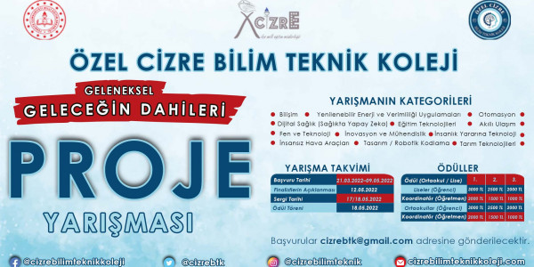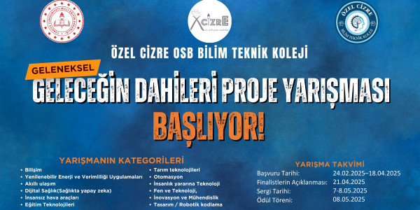 Özel Cizre OSB Bilim Teknik Koleji'nin ev sahipliğinde ve İlçe Milli Eğitim Müdürlüğü iş birliğiyle düzenlenen geleneksel "Geleceğin Dahileri" proje yarışmasının başvuru süresi, yoğun talep üzerine 16 Mayıs tarihine kadar uzatılmıştır.